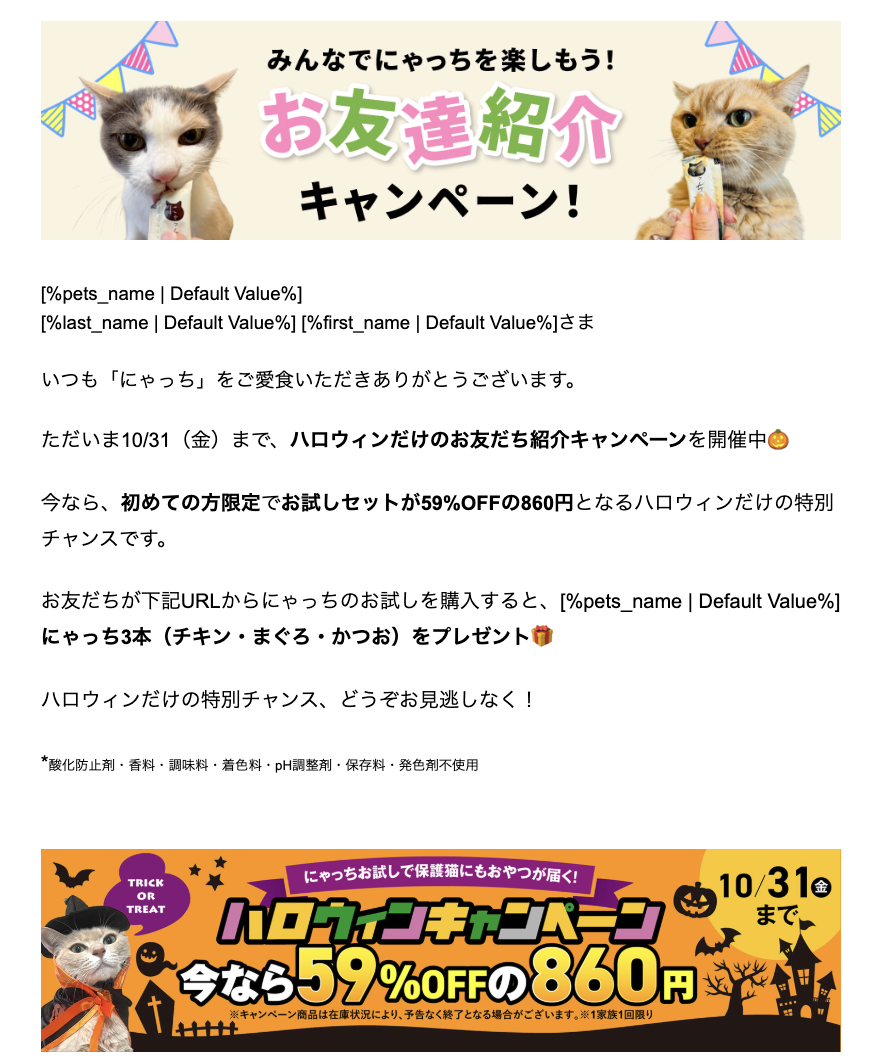 紹介した方がにゃっちのお試し購入で、紹介者ににっちゃち3本(チキン・まぐろ・かつお)プレゼント